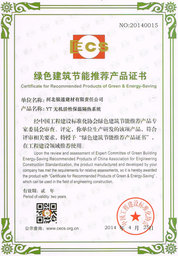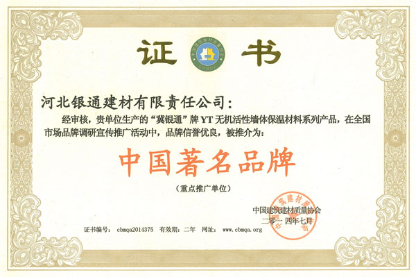 河北銀通建材有限責任公司,專注于環保節能新型保溫材料的研發和推廣,是北京質量檢驗認證協會會員單位,公司產品YT無機活性保溫材料;無機輕集料保溫砂漿,無機保溫砂漿榮獲住建部:綠色建筑節能推薦產品證書;中國著名品牌;全國保障性住房建設用材優秀供應商: